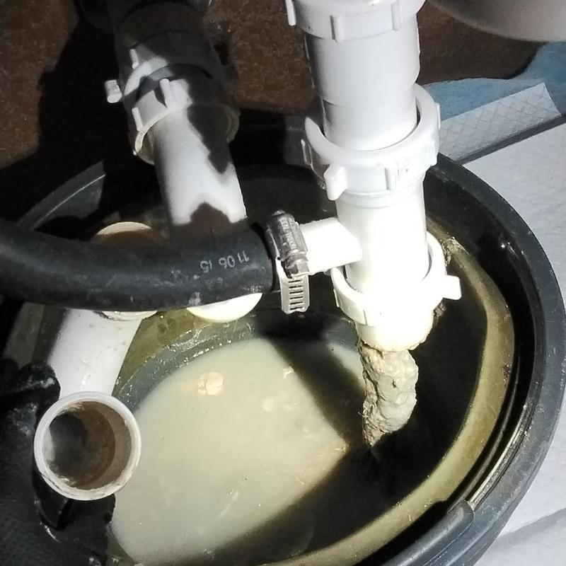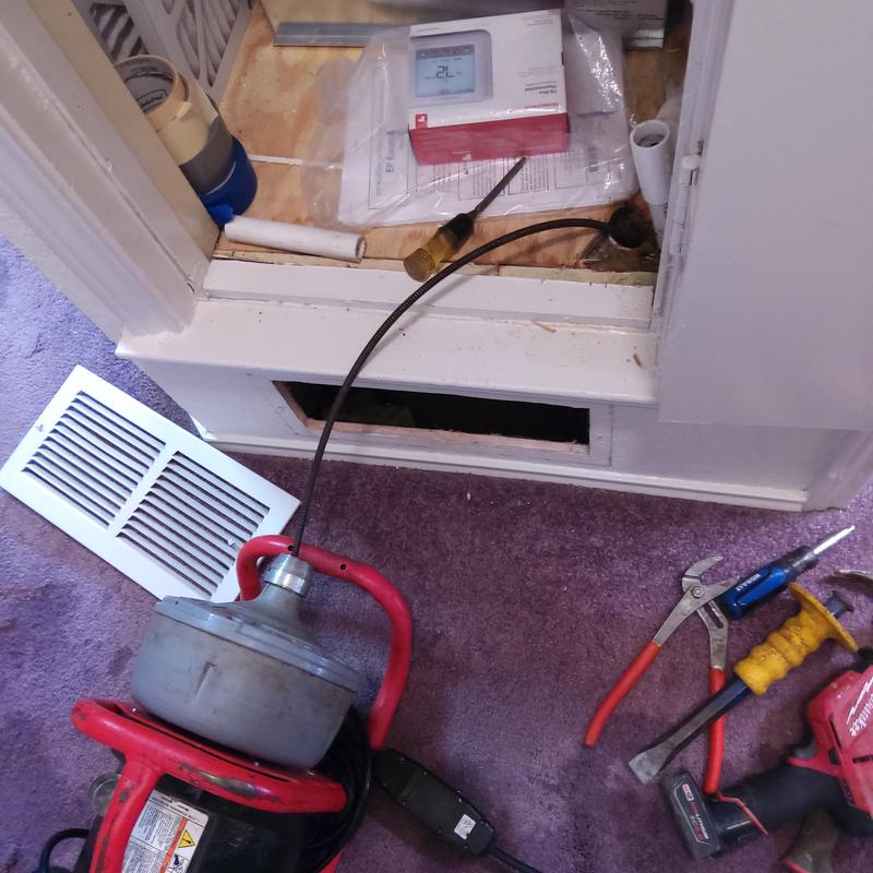 A plumber in Arlington, Texas removed a tubular P-trap beneath a bathroom sink to run a cable and clear an air conditioning drain stoppage. This service restored proper drainage flow and prevented water backup from the AC system.