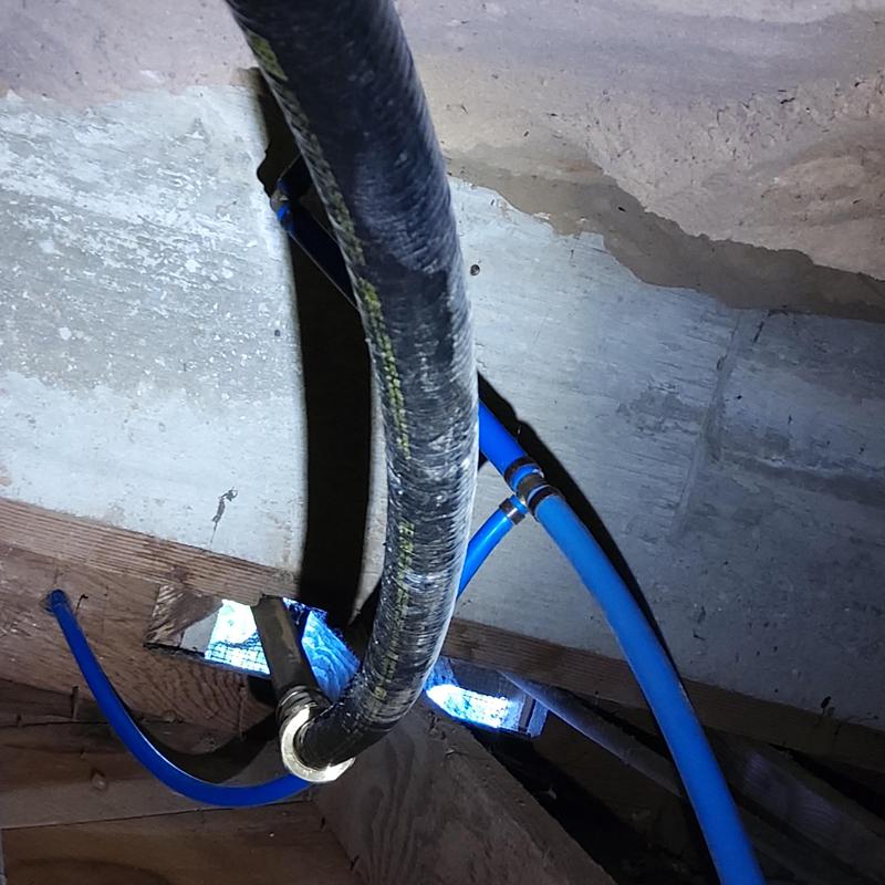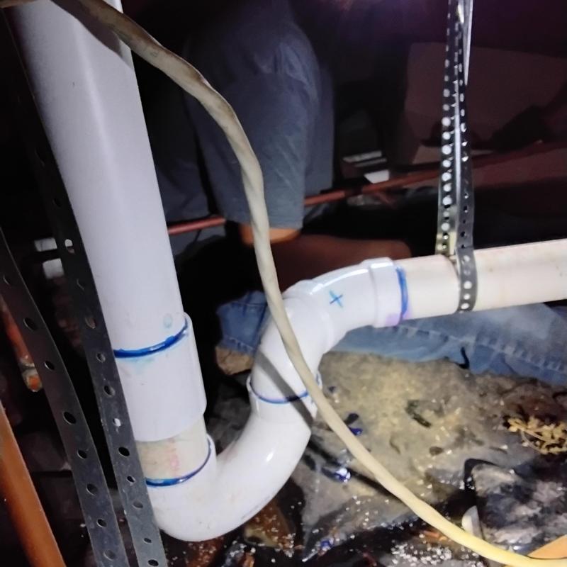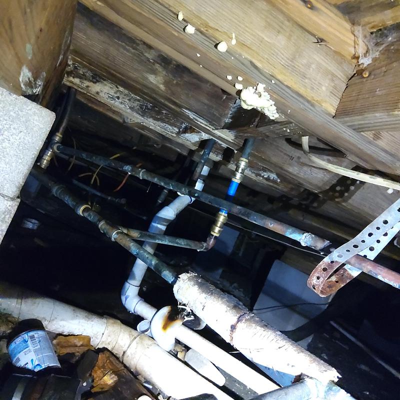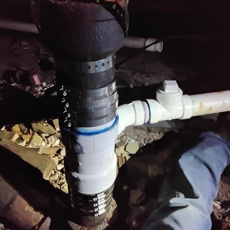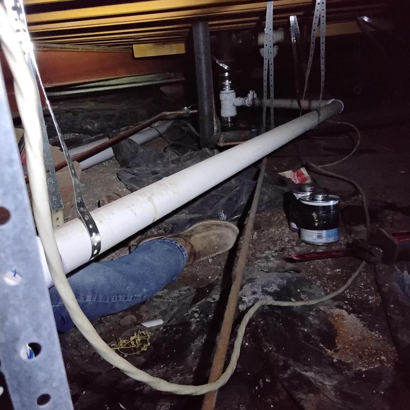 PLUMB SHIELD PLUMBING LLC completed plumbing repairs and installations in the crawl space of a property in Brunswick, GA. The work included securing and connecting PVC drain pipes with metal straps, installing flexible hoses for water supply lines, and attaching a rubber coupling with multiple clamps to a cast iron pipe for drainage.
