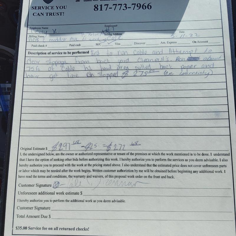 Plumb Shield Plumbing LLC performed an emergency drain stoppage service using a cable and camera combo in Springtown, Texas. The team cleared the blockage and inspected the pipe with a video camera to verify full system flow and identify any damage or obstructions.