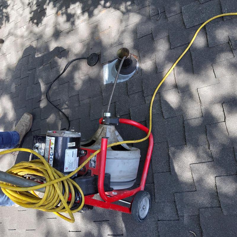 A plumber cleared a drain blockage by running a snake through a roof vent during an emergency stoppage in Hurst, Texas. This method restored drainage without needing access from inside the home.