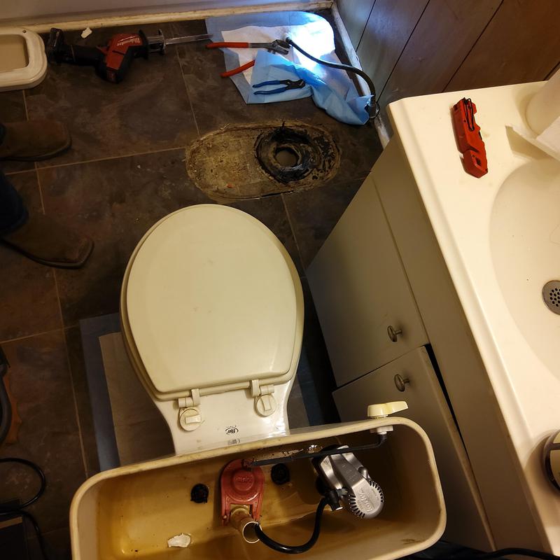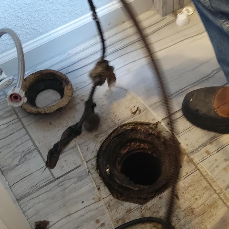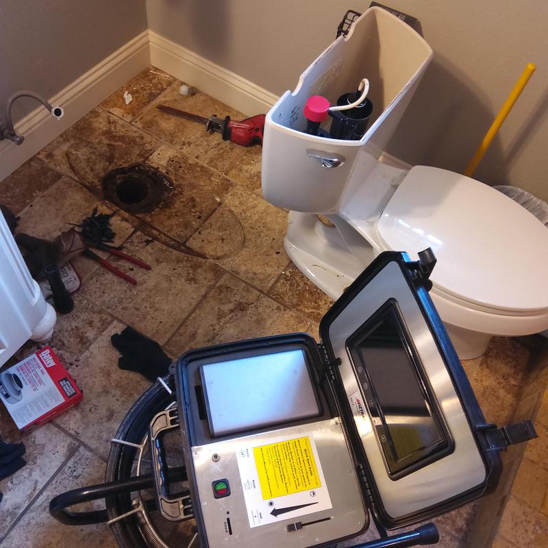 A plumbing technician in Fort Worth, Texas removed a toilet to access the sewer line, used a cable and camera system to clear a blockage, and identified breaks in an aging cast-iron pipe. This service helps diagnose and restore proper drainage function in older plumbing systems.