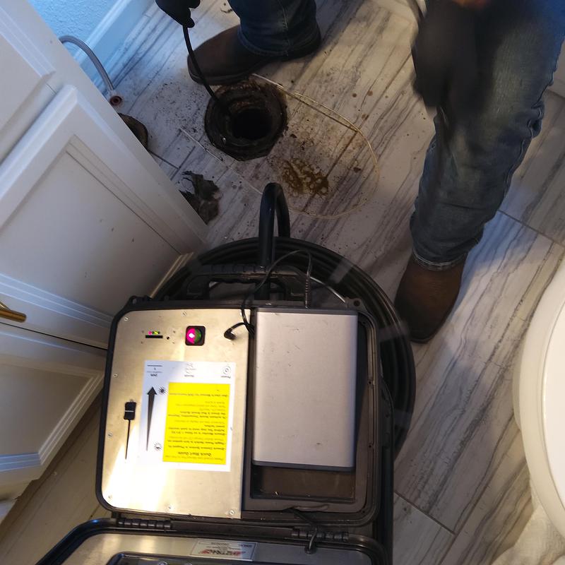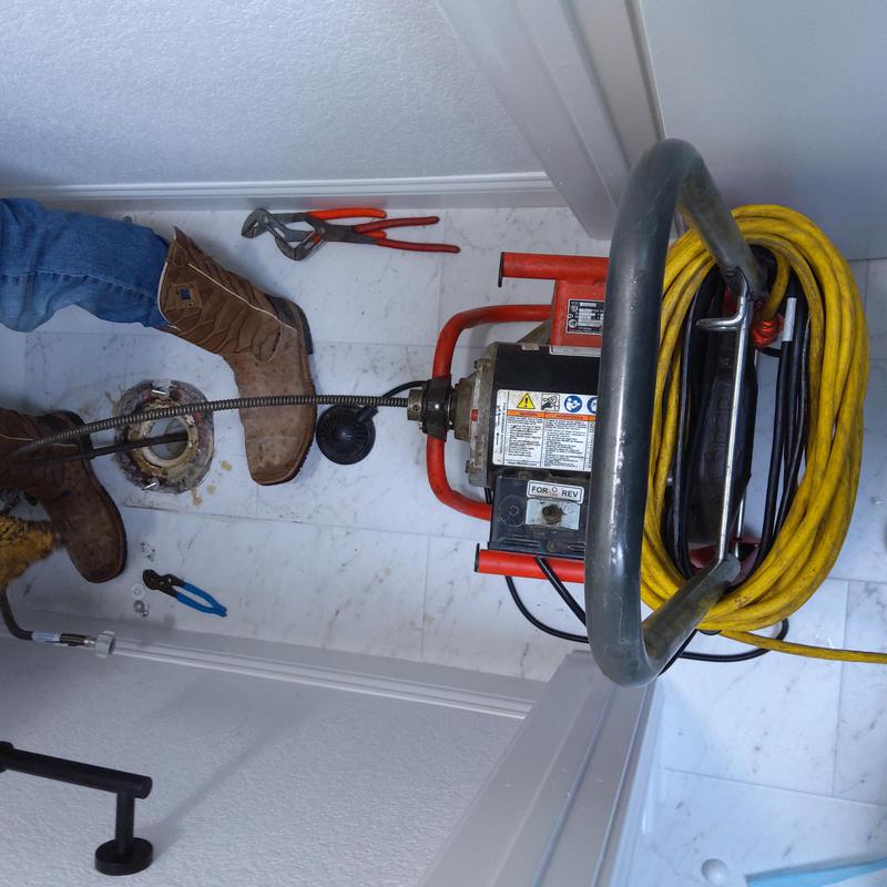 Plumb Shield Plumbing LLC cleared an emergency drain stoppage in Weatherford, Texas. The team ran a cable with a camera to locate the blockage, removed the toilet to access the line, and reinstalled the toilet after completing the service.