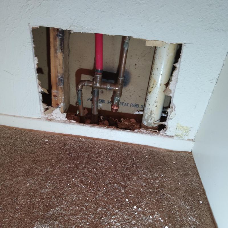 A plumber accessed the wall and located a leak on the cold water manifold in Fort Worth, Texas. The job required cutting through drywall to isolate the problem and identify the source of the water issue efficiently.