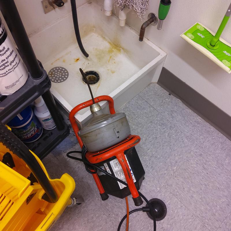 Plumb Shield Plumbing LLC cleared a clogged mop sink in a men's restroom using a roto-rooter method in Arlington, Texas. The team removed the blockage to restore normal water flow and ensure proper drainage functionality.