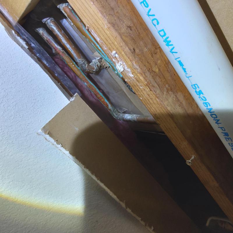 Plumb Shield Plumbing LLC repaired an emergency interior water leak in Euless, Texas. The plumber replaced one foot of damaged ½-inch copper pipe with new ½-inch PEX piping to stop pinhole leaks and restore safe water flow.