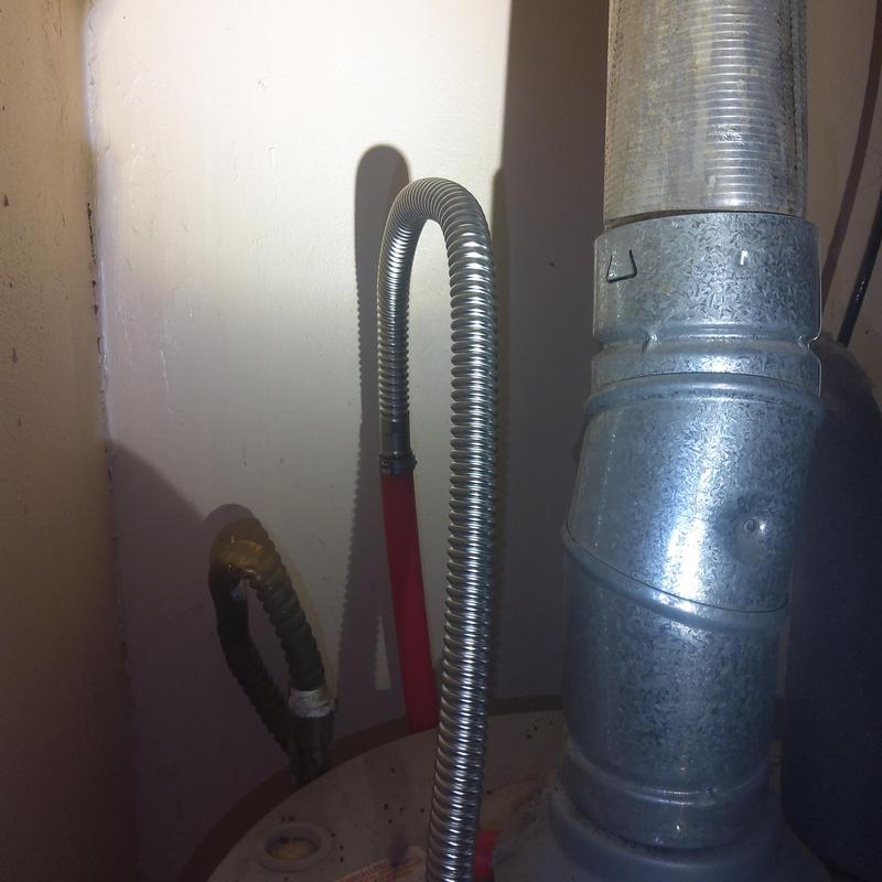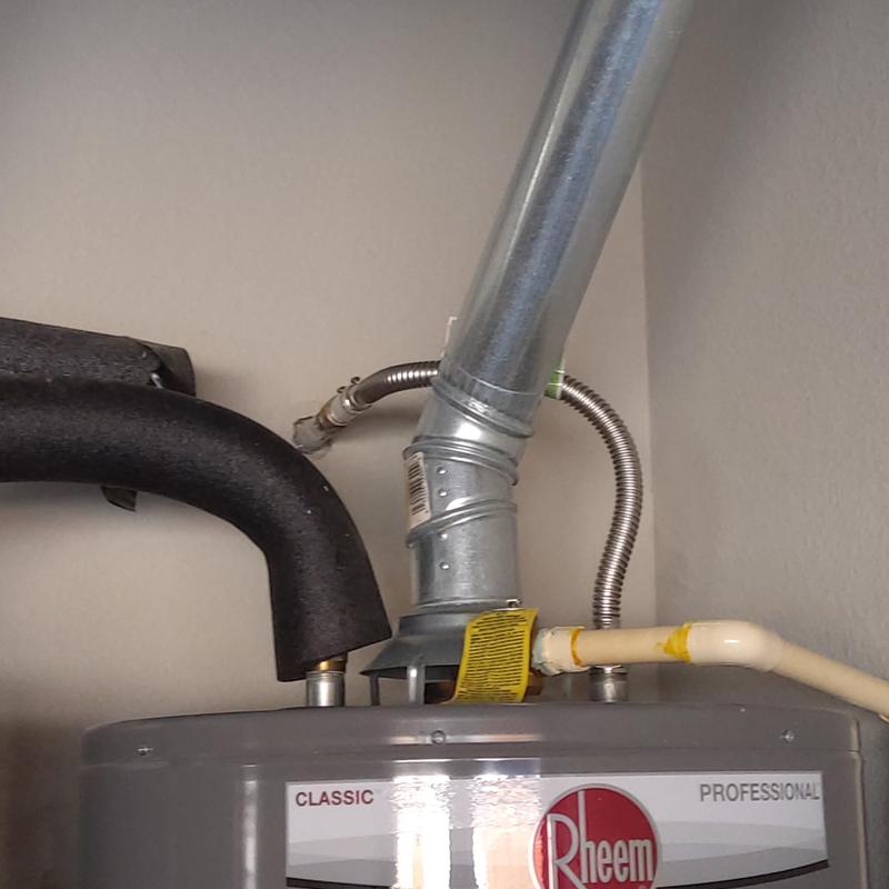 Plumb Shield Plumbing LLC replaced a 50-gallon gas water heater in a garage in North Richland Hills, Texas. The work included installing a drain pan, pan drain, new ball valve, and flexible connectors to meet current code requirements.