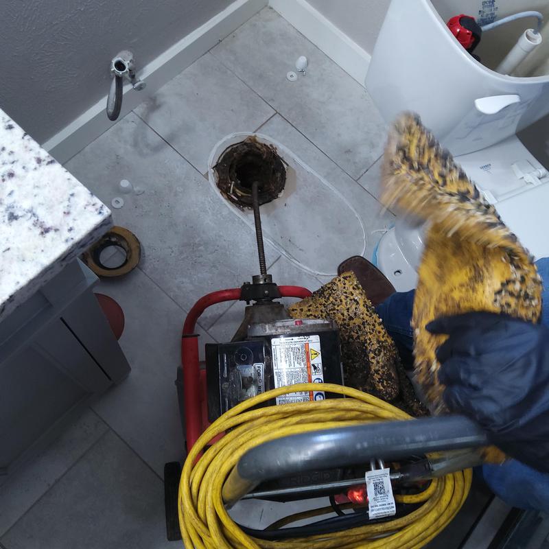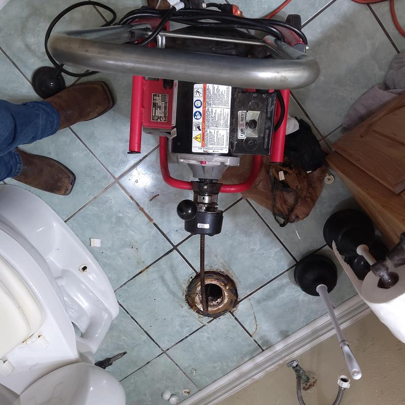 Plumb Shield Plumbing LLC cleared an emergency drain blockage and reinstalled a toilet after running a cable through a 90-degree pipe bend in Fort Worth, Texas.
